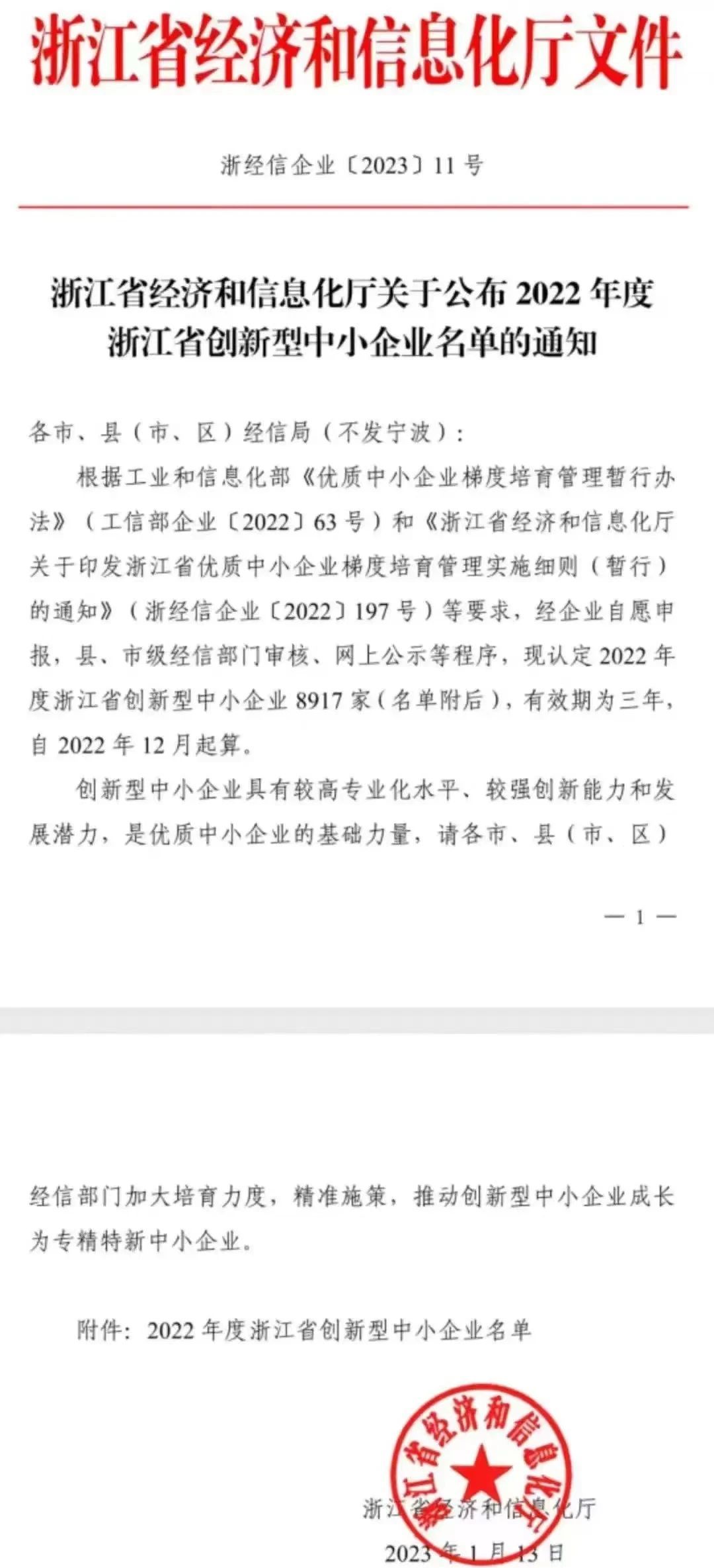 近日,浙江省經(jīng)濟(jì)和信息化廳公布了“2022年度浙江省創(chuàng)新型中小企業(yè)”名單,經(jīng)過(guò)公開(kāi)申報(bào)、經(jīng)濟(jì)和信息化主管部門初審?fù)扑]、專家評(píng)審、網(wǎng)上公示等極為嚴(yán)格的評(píng)審標(biāo)準(zhǔn)等程序。